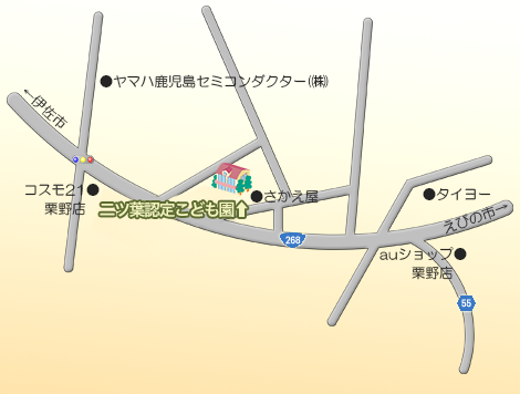 〒899-6202 鹿児島県姶良郡 湧水町北方805 社会福祉法人 湧水美空福祉会 二ッ葉認定こども園 TEL:0995-74-2052 FAX:0995-74-1050 メールはこちらから